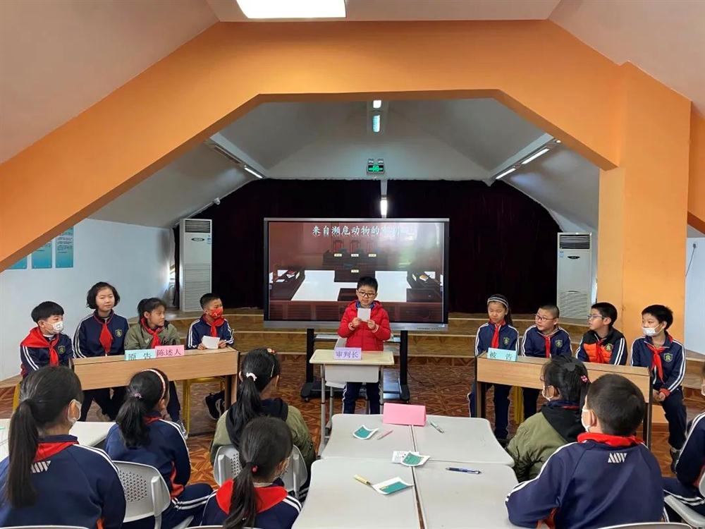 同学们还化身保护动物小使者,小组合作,聚焦大熊猫、东方白鹳、北极熊三种动物的现状,为“原告”们撰写濒危“证词”;“被告”代表结合人类社会的发展实际进行辩论;“小法官们”公正“判决”。最终,大家提出了具体的动物保护措施,倡导人类保护濒危动物,爱护家园环境。认真的思索、精彩的发言后,每位积极参与的小书虫还获得了“保护动物小使者”徽章!